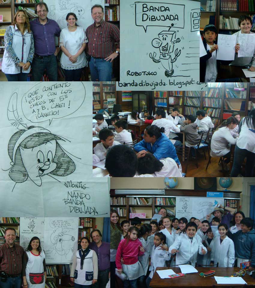 Convocados por Patricia (Bibliotecaria Escuela) Banda Dibujada (representada por Nando) tuvo el gusto de brindar actividades en donde, tanto los chicos como los docentes participaron activamente. El entusiasmo creativo de los niños y niñas, y el compromiso de todos el cuerpo docente de la Escuela marcaron otra mañana inolvidable en el andar de los mismos.